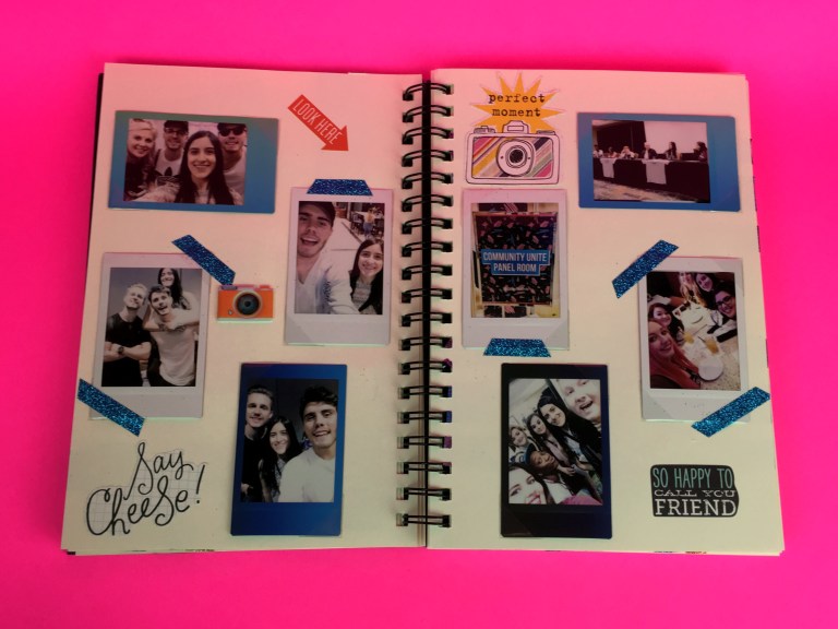 Looking for ways to display your instant pictures? What I ended up doing was make a scrapbook with a few of my favorite pictures from a convention that I went to recently! I decorated with stickers, ribbons and glitter… which enhanced my pictures in so many ways! This journal is like a capsule of fun memories thanks to my instant film.